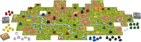 | Verpakkingsinhoud | Inhoud:, 188, tegels, 54, meeples, 6, abten, 6, grote, meeples, 20, handelswarenfiches, 6, varkens, 6, bouwmeesters, 1, speciale, dobbelsteen, 8, nieuwsberichten, 8, houten, veerboten, 1, overzichtstegel, 16, houten, goudstaven, 1, lila, tovenaar, 1, oranje, heks, 6, houten, rovers, De, spelregels |