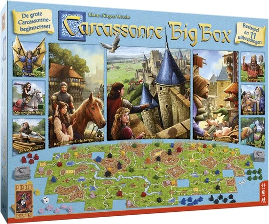 Carcassonnepakket met het basisspel en maar liefst 11 uitbreidingen in het nieuwe artwork! Hiermee kun je oneindig variëren. Het speelmateriaal past praktisch in de doos, waardoor je alles altijd gemakkelijk bij de hand hebt. Wat zit er precies in? Het basisspel Kathedralen & Herbergen Kooplieden & Bouwmeesters De Abt De Rivier De Vliegtuigen De Veerboten Nieuwsberichten De Goudmijnen Tovenaar & Heks De Rovers De Graancirkels