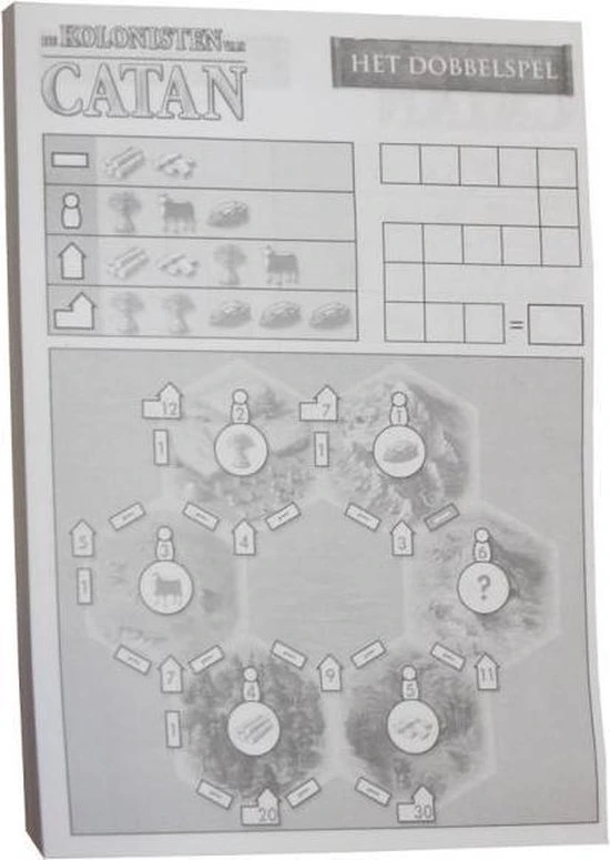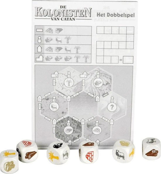 In dit spannende spel bouwen de spelers Catan worp na worp op. Elke straat en elke nederzetting levert punten op. Een gelukkige hand en tactisch vernuft bepalen wie de beste ontdekker is. Je krijgt een velletje papier waar de uit Catan bekende straten, dorpen en steden op staan. Als je aan de beurt bent, mag je drie keer met de dobbelstenen gooien om een combinatie samen te stellen waar je wat aan hebt. Gooi je geen enkele combinatie, dan krijg je strafpunten. Dat kun je voorkomen door ridders te kopen, die je de mogelijkheid geven om een dobbelsteen naar een bepaalde grondstof te draaien. Dit vlotte dobbelspelletje speel je weg in een klein half uurtje en past prima in je reisbagage. En, zijn je scoreblokken op? Geen nood, je kunt extra scoreblokken bij ons bestellen.