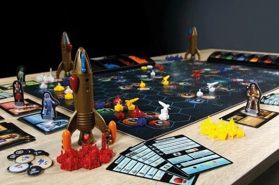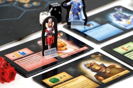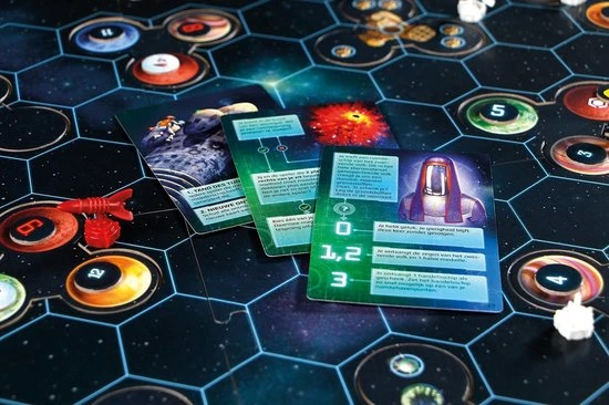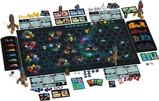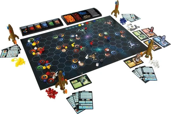 | Verpakkingsinhoud | Inhoud:, 4, grote, moederschepen, 24, boordkanonnen, 24, aandrijvingen, 20, vrachtmodulen, 28, gekleurde, kogels, 6, speelvelddelen, 16, ruimtekwadranten, 4, pionnen, 40, halve, medailles, 36, getallenfiches, 16, speciale, fiches, 100, grondstoffenkaarten, 32, ontmoetingskaarten, 20, vriendschapskaarten, 12, overzichtskaarten, 92, speelstukken, 2, dobbelstenen, 2, speelmateriaalhouders, 1, stickervel, De, spelregels, De, almanak, 11, plastic, zakjes> |