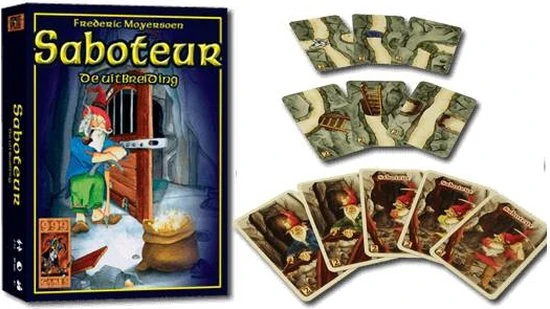 Uitbreiding op het populaire rollenkaartspel Saboteur. Het spel bevat nieuwe rollen en actie- en gangenkaarten. Zoals gebruikelijk zijn er de schatzoekende dwergen, maar ze zijn nu verdeeld in een groen en een blauw team. Maar deze keer zijn ze niet de enigen. Zo is er de chef, die wint als de goudzoekers winnen, maar altijd 1 goudstuk minder krijgt. De profiteur is helemaal een aparte. Hij wint altijd, maar moet het wel met 2 goudstukken minder doen. De geoloog daarentegen is helemaal niet in de schat ge?nteresseerd. Hij zoekt liever naar waardevolle kristallen. Met deze uitbreiding wordt Saboteur nog hectischer en spannender. Ideaal voor grote groepen tot 12 spelers! Pluspunten: