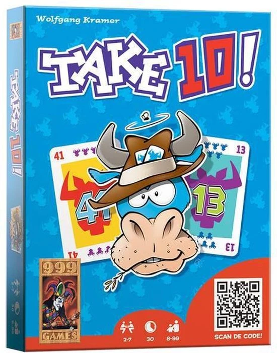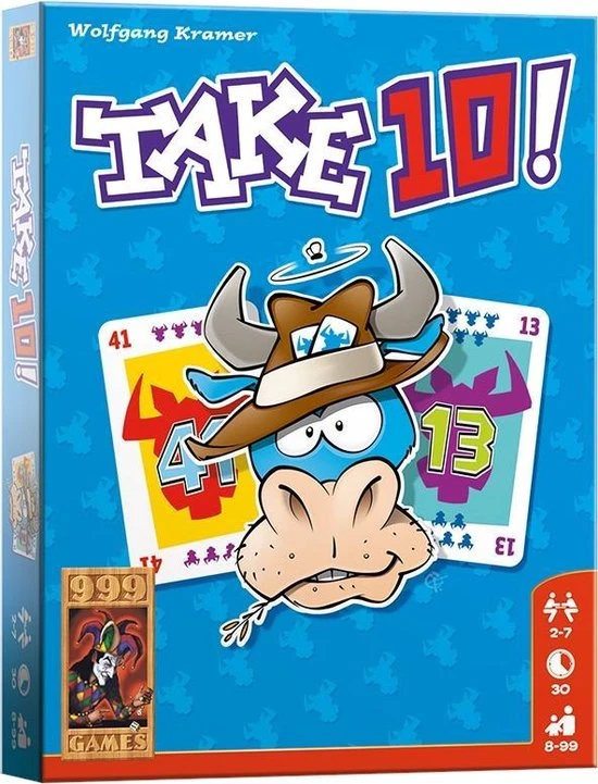 Variant op het partyspel Take 5! In dit vlotte kaartspel leggen de spelers steeds een kaart op een stapel, waarbij het verschil tussen de twee waarden niet groter mag zijn dan 10. Kan iemand dat niet, dan moet hij een stapel en eventueel een stierenkaart in zijn hand nemen. Wie is als eerste zijn kaarten kwijt? Als je aan de beurt bent leg je steeds een kaart op een stapel. Daarbij mag het verschil tussen de waarde op de bovenste kaart en die op de gespeelde kaart niet groter zijn dan 10. Kan of wil je dat niet, neem dan ??n van de stapels in je hand en een stierenkaart. Vanaf nu mag je ook meerdere kaarten op een stapel leggen, zolang het verschil tussen de waarden 10 of lager is. Heb je meerdere stierenkaarten, dan mag je zelfs kaarten op meerdere stapels leggen. Take 10! heeft eenvoudige spelregels, maar verrassend veel diepgang!