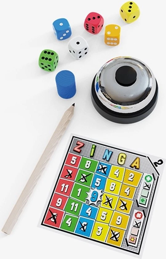 Zinga is een vrolijk dobbelspel, waarbij roll & write wordt gecombineerd met een reactiespel. Om te winnen moet je snel zijn, maar kijk uit voor fouten! Een combinatie noemen die niet bestaat, te lang wachten met iets noemen of jezelf herstellen na een verspreking wordt al gezien als een fout.