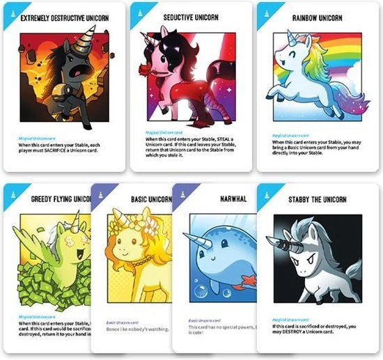 Probeer al eerste speler 7 eenhoornkaarten in jouw ‘stal’ (i.e. voor je op tafel) te verzamelen. Ieder speler begint met een baby eenhoorn in hun stal en tijdens een speelbeurt kun je ervoor kiezen een eenhoorn uit je handkaarten in stal te leggen ?f een effectkaart te spelen om je tegenstanders dwars te zitten. Je kunt dan bijvoorbeeld eenhoorns uit de stal van een tegenstander verwijderen of iedereen een eenhoorn laten afleggen