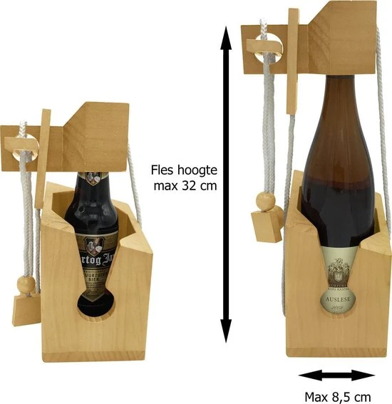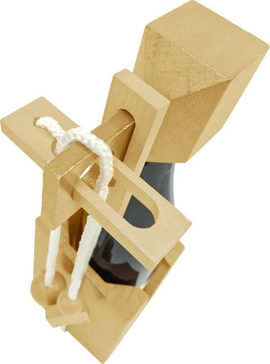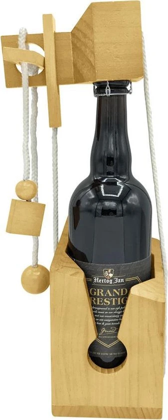 De puzzel bestaat uit een aantal houten stukken en balletjes aan een verbindingskoord. Op het eerste gezicht lijkt het een onmogelijke puzzel, maar er is toch echt een manier om de fles eruit te krijgen zonder hem te breken. Inclusief instructies om de fles erin en er weer uit te krijgen.