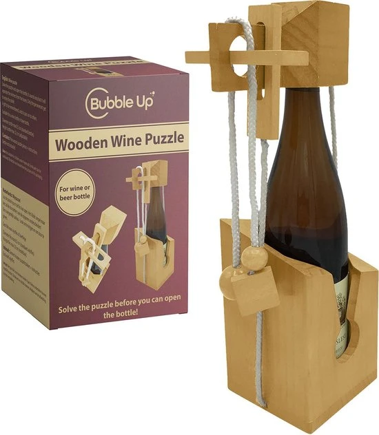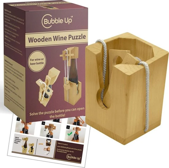 Met de wijnpuzzel geef je een cadeau dat nog lang herinnerd zal worden. De ontvanger moet eerst de puzzel oplossen voordat de fles open kan. Geschikt voor o.a. wijnflessen en bierflessen.