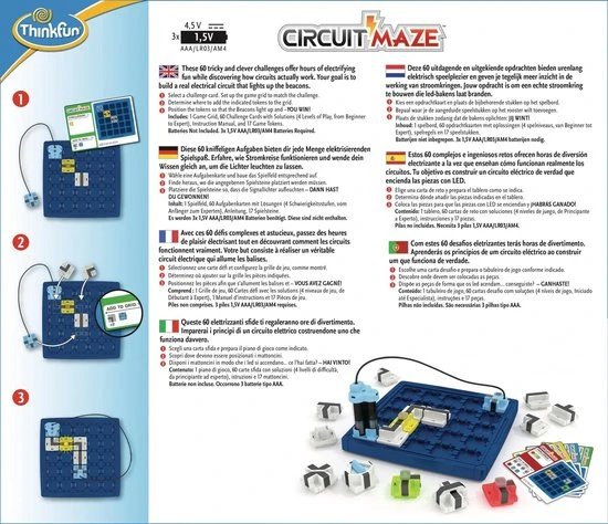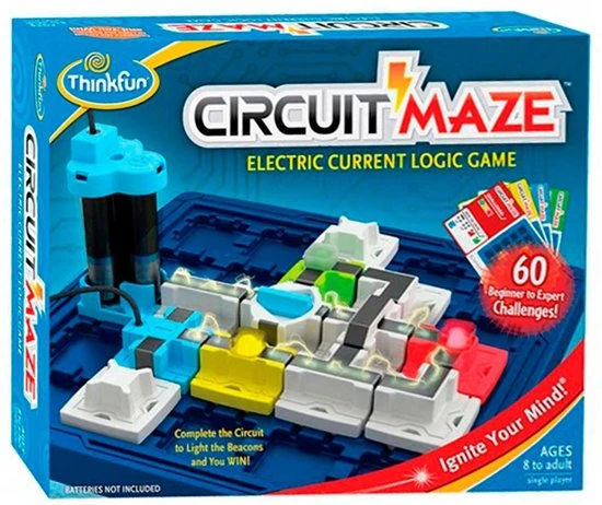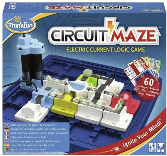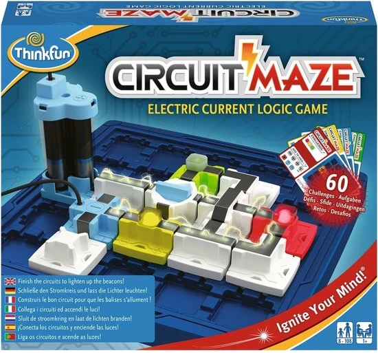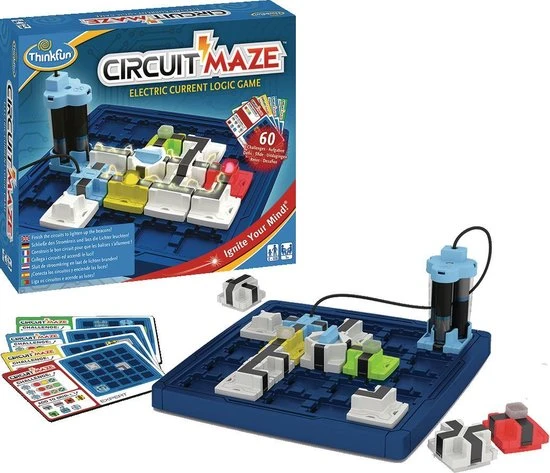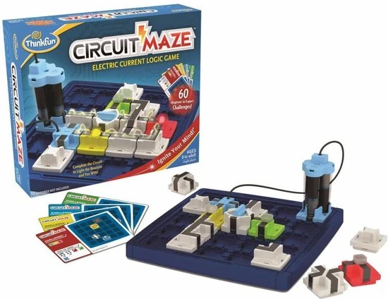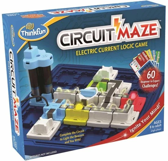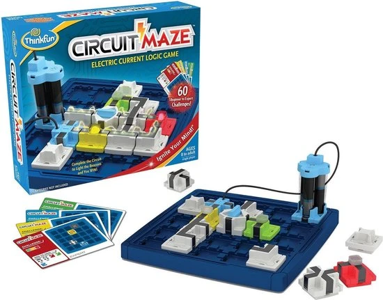 Laat uw hersenen werken met dit Circuit Maze elektrische stroom denkspel van Thinkfun! Het doel is de blokjes zo te ordenen dat je een echte stroomkring maakt en de lampjes oplichten. Er zijn 60 moeilijke en uitdagende opdrachten die gegarandeerd zorgen voor uren elektrisch speelplezier terwijl u ontdekt hoe stroomkringen werken. Kies een opdrachtkaart en richt het speelbord in. Bepaal dan waar de aangegeven speelstukken geplaatst moeten worden. Plaats vervolgens de stukken zodanig dat de lampjes oplichten en WIN! Dit denkspel voor 1 persoon zal de hersenen in een mum van tijd doen kraken! Dit spel is geschikt voor kinderen en volwassenen om de tijd te doden. De set bevat 1 speelbord, 60 opdrachtkaarten met oplossingen en 17 spelstukken. Hij heeft 3 AAA-batterijen nodig (niet meegeleverd).