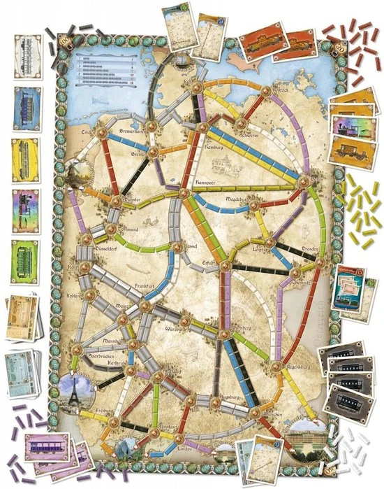 Bouw treinroutes op de actuele kaart van Duitsland en volbreng je bestemmingskaarten. Dit doe je door verbindingen tussen steden te claimen, die je mag bouwen als je de juiste kaartencombinaties in handen hebt.