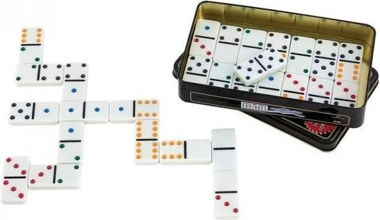 Domino spel in gekleurd blik met deksel. Afmetingen 50 x 25 x 10mm. Stenen van urea kunststof met gekleurde ogen.
