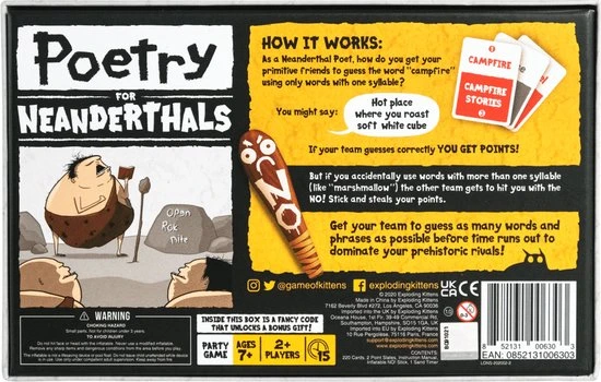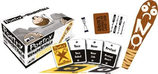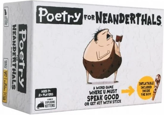 Poetry for Neanderthals is een kaartspel van de makers van Exploding Kittens. In dit familievriendelijke partyspel verdienen spelers punten door hun teamleden woorden en zinnen te laten raden. Ze mogen hiervoor alleen maar woorden gebruiken met ??n lettegreep! Als de spelers woorden gebruiken met meer dan een lettergreep, mag het andere team hen slaan met een opblaasbare knuppel.