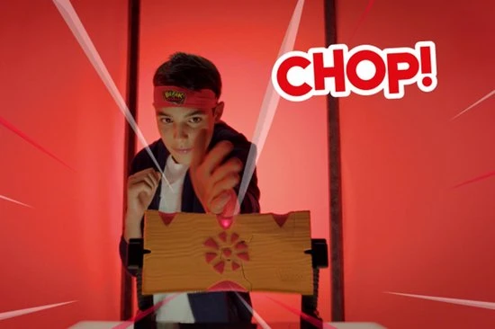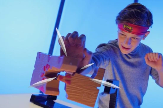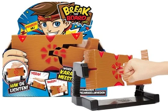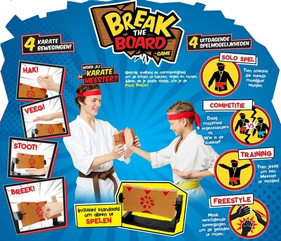 Word jij de nieuwe Karate Meester? Heb jij de beste karatevaardigheden om de lichten te hakken, vegen en stoten? De lampjes op de plank geven aan wat je moet doen, maar doe het snel en nauwkeurig, want alleen dan slaag je erin de plank te breken! Daag tot max. 9 tegenstanders uit: wie is de snelste? Of train jezelf met het bord op een standaard. Tien niveau’s die steeds moeilijker worden! Je wordt aangemoedigd door je trainer. Maak verschillende bewegingen om de geluiden te mixen. Batterij informatie: 3 x AAA batterijen (meegeleverd). Afmeting spel: 27x7x17cm (lxbxh). Afmeting verpakking: 27x11x27cm (lxbxh). Leeftijdsindicatie: 6 jaar+.