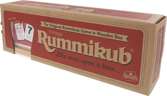 Rummikub Vintage is de chique, nostalgische uitvoering van het bekende spel. Rummikub wordt al decennialang gespeeld en deze uitvoering is bij veel spelers favoriet. De stenen zijn van urea, dat is een verzwaarde kunststof en ze liggen lekker in de hand. Het materiaal wordt opgeborgen in een handig, houten kistje. Echt een handig kistje, want de vier zijden gebruik je als rekje.