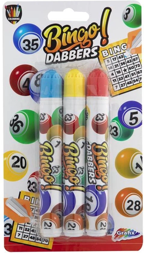 3x Bingo stiften blauw, geel en rood. Met deze handige bingo stiften zet u snel en makkelijk stippen op de nummers met bingo. Let op: dit is geen speelgoed en niet geschikt voor kinderen.