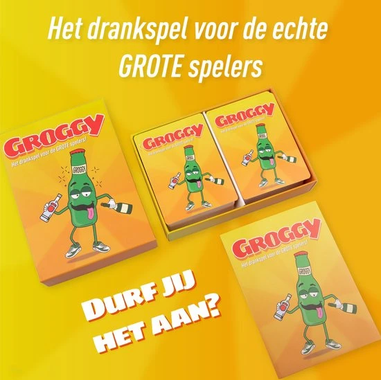 Groggy is een drankspel dat bestaat uit 160 kaarten. De kaarten zijn ingedeeld in 4 verschillende categorie?n. De categorie ?Degelijke Donnie? bevat 75 kaarten. De categorie ?Spicy Baby? bevat 40 kaarten. De categorie ?Crazy Mother*******? bevat 25 kaarten en de categorie ?minigames? bevat 20 kaarten. Ook zit er een handleidingboekje in de verpakking, waarin de minigames worden uitgelegd.