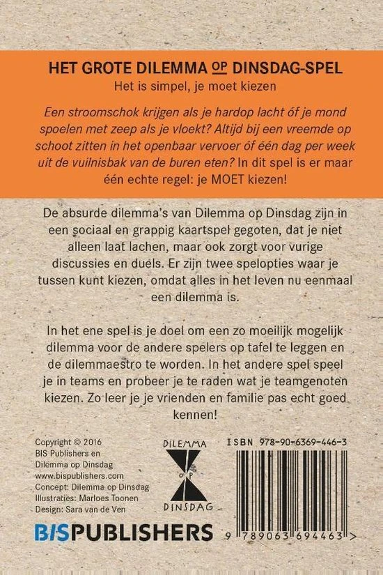 De makers van Het Grote Dilemma op Dinsdag-boek zijn terug! In dit geweldige spel met mooie illustraties en lachwekkende dilemma?s is er maar ??n echte regel: je MOET kiezen?