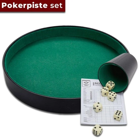 ? En een dobbelbeker met dobbelsteenbak(? 26 cm) afgewerkt met geluidsdempende voering voor een optimale spelervaring.