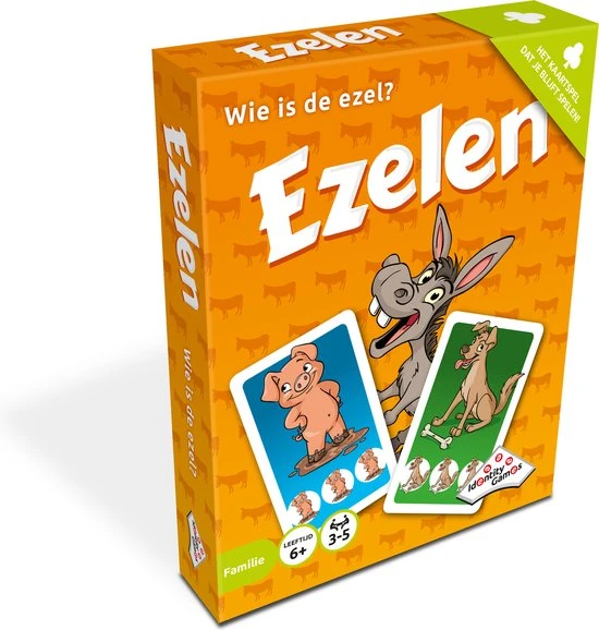 Ezelen met de hele familie! Ezelen, het vrolijke kaartspel dat iedereen kent, nu in een nieuwe uitvoering. Met grappige dierenkaarten en echte ezels. Ezelen is een gezellig, hectisch en snel spel voor de hele familie. Schuif de kaarten naar elkaar, verzamel vier dezelfde en pak als eerste een ezel. Te laat? Dan word je de ezel!