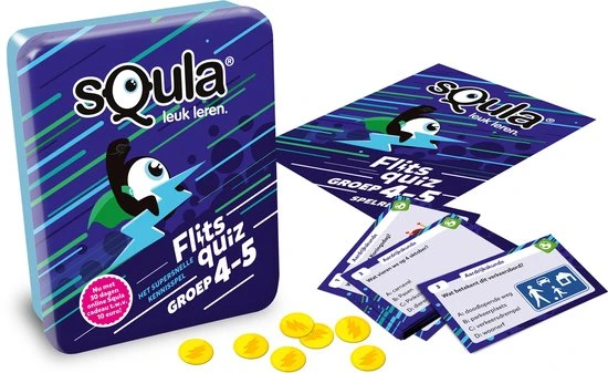 Flitsquiz voor groep 4 en 5! Test je kennis in dit flitsende kaartspel! Geef jij als snelste het juiste antwoord? Het spel bestaat uit meer dan 100 uitdagende vragen over verschillende basisschoolvakken. Draai een kaart open op tafel en bedenk het goede antwoord. Weet jij het juiste antwoord? Wees dan snel, voor je het weet is iemand je voor! Degene met de meeste punten wint. Speel snel en slim. Klaar voor de start?… Flits! Veel speelplezier!