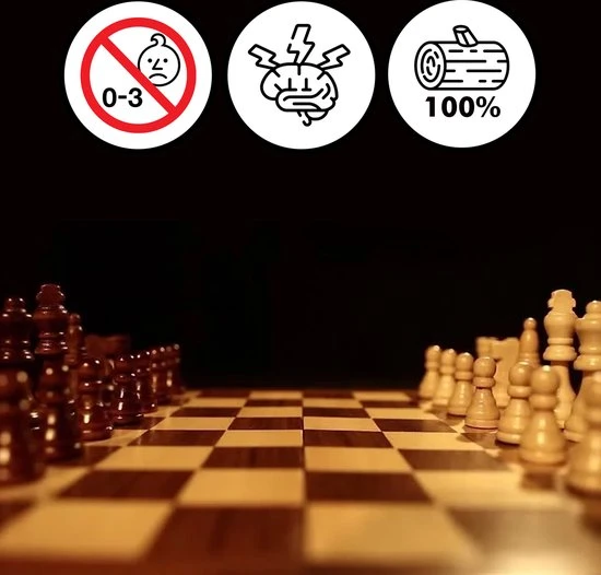 Ondanks het houten materiaal is dit bord met stukken maar 266 gram zwaar. Het is niet geschikt voor kinderen onder de 3 jaar, vanwege het verstikkingsgevaar door de kleine stukken. Het is gemakkelijk op te vouwen en op te bergen in de doos.