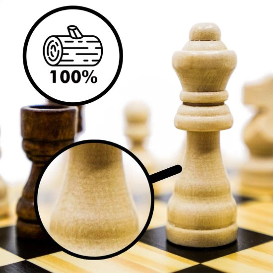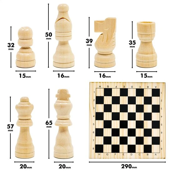Ondanks het houten materiaal is dit bord met stukken maar ??n kilogram zwaar. Het is niet geschikt voor kinderen onder de 3 jaar, vanwege het verstikkingsgevaar door de kleine stukken. Het is gemakkelijk op te bergen in de doos en daardoor handig om mee te nemen.