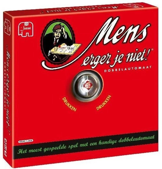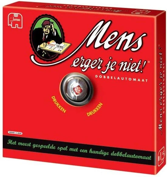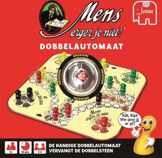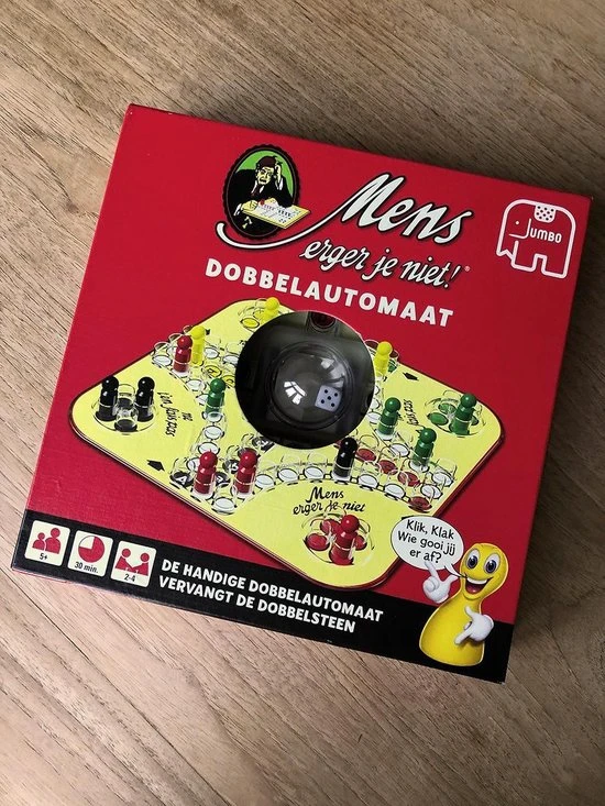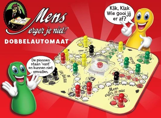 Deze luxe versie van Mens Erger Je Niet! met dobbelautomaat voorkomt het wegrollen van de dobbelsteen en het ‘per ongeluk’ verschuiven van de plastic pionnen. Mens erger je niet! Of misschien juist wel?