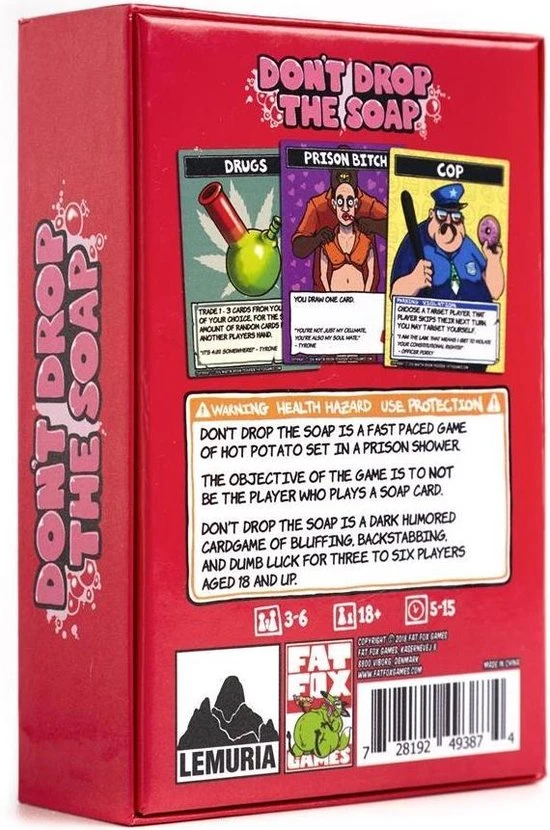 Don’t Drop The Soap is een snel party- en kaartspel met zwarte humor dat zich afspeelt in een gevangenisdouche. Spelers spelen de rol van gevangenen die elkaar letterlijk proberen te naaien. Dit spel heeft geen winnaars, alleen 1 verliezen: zorg dat jij niet de speler bent die de zeep laat vallen… Spelers van elke beurt moeten ??n actiekaart uit hun hand spelen. Het spel eindigt wanneer een speler geen opties meer heeft en gedwongen wordt een ‘soap’-kaart te spelen. Hoewel je misschien nooit een spelletje wint, kun je het spel wel zodanig be?nvloeden dat jij beslist wie verliest… Inhoud: 60 kaarten (inclusief 1 regelkaart).