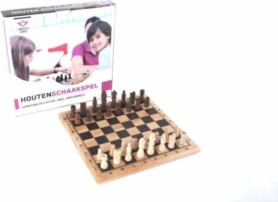 Altijd al willen schaken? Luxe houten uitvoering van het schaakspel. Steeds weer een uitdaging voor de hele familie. Het schaakbord heeft de afmetingen 30×30 cm en 1 schaakvlak heeft de afmeting van 33 mm bij 33 mm. Het schaakspel is inclusief speelstukken, de hoogte van de koning is 77 mm. Het schaakbord is gemaakt van berkenhout, de schaakstukken zijn van essenhout. Het schaakspel wordt geleverd in een luxe verpakking en is inclusief speelregels.