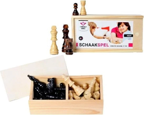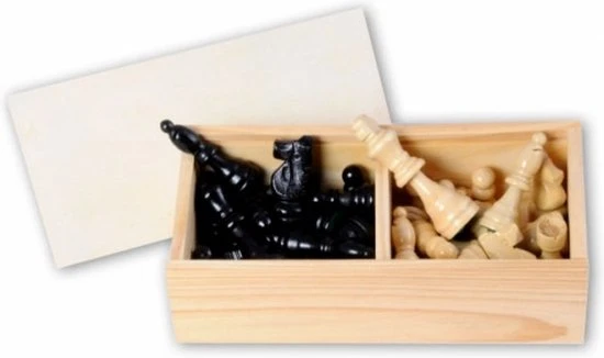 Altijd al willen schaken? Nooit meer rondslingerende schaakstukken met dit handige houten kistje gemaakt van Essenhout. Er zitten 32 schaakstukken in het kistje en ze zijn zwart/naturel van kleur. De koning heeft een hoogte van 77 mm. Het kistje heeft een schuifdeksel.