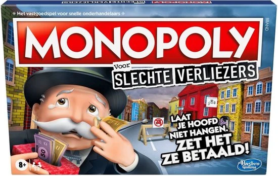 Laat je hoofd niet hangen … Zet het ze betaald! Heb je er genoeg van om te verliezen met Monopoly? Hier is het bordspel Monopoly voor slechte verliezers. Deze hilarische variatie op het Monopoly-spel maakt winnaars van de verliezers. Spelers verdienen geld door dingen te doen die doorgaans frustrerend zijn in het spel, zoals naar de gevangenis gaan, huur betalen of bankroet gaan. Wie echt op de rand van de afgrond staat, kan zich herpakken met de grote Mr. Monopoly-pion die een speler voordelen op alle andere spelers verleent. Dus begin te spelen, neem je langverwachte wraak en wees blij dat je verliest! Met dit spel voor spelers vanaf 8 jaar zal een spelletjesavond met de familie nooit meer hetzelfde zijn.