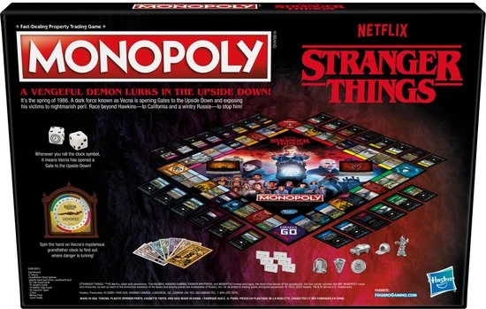 Het is 1986 en een duistere macht bekend als Vecna opent de poorten naar The Upside Down in Hawkins en daarbuiten! Het bordspel Monopoly: Stranger Things editie is ge?nspireerd op seizoen 4 van de Netflixserie Stranger Things, een must-have voor fans. Draai de wijzer van Vecna’s onheilspellende klok om erachter te komen waar de poorten zijn en sluit deze zo snel mogelijk. Spelers verdienen in het spel geld door andere spelers huur te vragen en de laatste speler die nog geld heeft als alle andere spelers failliet zijn, wint. Maar pas op! Het spel is ook afgelopen als Vecna genoeg poorten heeft geopend om alle locaties in The Upside Down te krijgen. Dan verliezen alle spelers! Het spel is voor 2-6 spelers en het is een geweldig bordspel voor volwassenen en tieners vanaf 14 jaar. STRANGER THINGS: ?/? Netflix. Gebruikt met toestemming. De namen en logo?s van Hasbro, Hasbro Gaming, Parker Brothers en Monopoly, het kenmerkende ontwerp van het spelbord, de vier hoekvakjes, de naam Mr. Monopoly en het figuurtje, evenals elk van de kenmerkende elementen van het bord en de pionnen zijn handelsmerken van Hasbro voor haar beroemde gezelschapsspel en toebehoren.