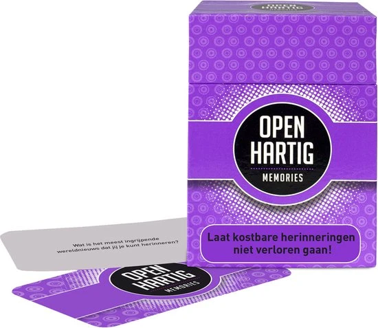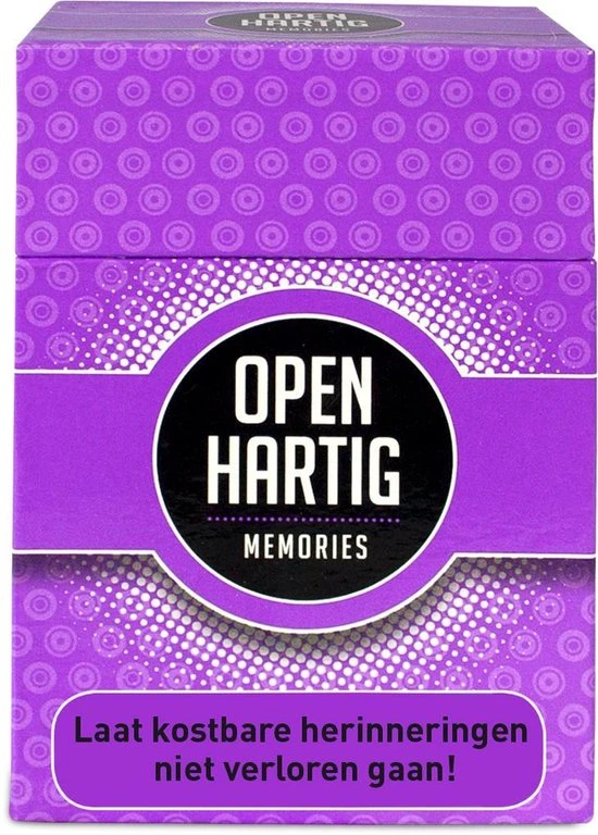 Je kent meestal maar een stukje van elkaars geschiedenis waardoor veel waardevolle verhalen, herinneringen en ervaringen verloren kunnen gaan. MOODZZ komt in haar succesvolle spellenserie ?Openhartig? met een hele mooie aanvulling; ?Openhartig Memories?. Openhartig Memories biedt een prachtige gelegenheid stil te staan bij het leven van je opa, oma, vader, moeder, kinderen, vrienden of andere dierbaren. De vragen gaan over de tijd waarin we nu leven en de tijd waarin de spelers opgroeiden. Deze meer dan 100 vragen maken gesprekken los over vroeger en nu en slaan een brug tussen generaties.