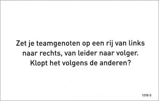 Deze en vele andere vragen en opdrachten zullen zorgen voor verrassende antwoorden, serieuze overdenkingen, nieuwe ontdekkingen, team spirit en bovenal? voor veel plezier met elkaar. Laat je verrassen, versterk jullie band en word samen nog succesvoller. Dit dynamische spel is bestemd voor twee of meer spelers en kan binnen elke groep, elke club of elk bedrijf gespeeld worden. Speel openhartig voor de ware team spirit maar bovenal voor veel plezier met elkaar.