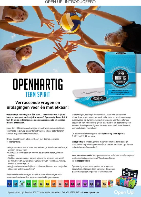 Gezamenlijk hebben jullie ??n doel…, maar hoe sterk is jullie band en hoe goed werken jullie samen? Openhartig Team Spirit laat dit jou en je teamgenoten op een verrassende en speelse manier ontdekken.
