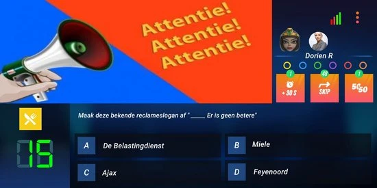 Haal het meeste uit verrassingsbonussen en pas op voor de turbomodus! Verdien ‘Assists’ en krijg 30 seconden extra om na te denken I Vergroot jouw kansen en ga voor 50/50 I SKIP naar de volgende vraag.