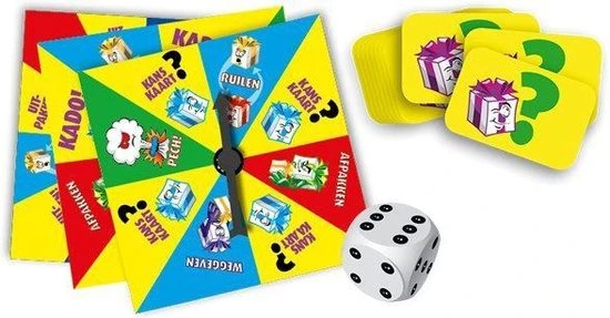 Luxe doos met 50 kanskaarten, 3 speelborden: verdeelbord, uitpakbord en finalebord, draaiwijzer en dobbelsteen