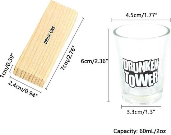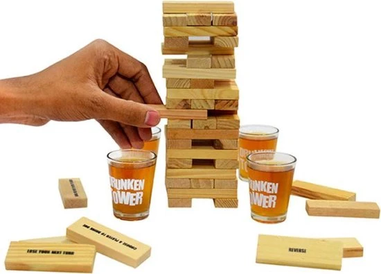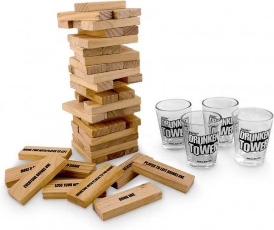 Een avondje gezellig wat drankjes doen met je vrienden of familie? Hier hoort natuurlijk wel een leuk drankspel bij. Maak het spannend, maar ook zeer vermakelijk met de drankspel variant van Jenga. Iedereen kent het principe van Jenga wel, de houte steentjes trekken en terugleggen totdat de toren valt. Bij de Drunken Tower werkt het iets anders. De set bevat “schone” blokken en blokken met commando’s. De helft van de stenen bevat een commando dat moet worden uitgevoerd nadat je het hebt verwijderd.