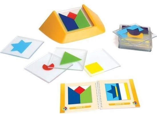 18 doorzichtige plaatjes met vrolijk gekleurde vormen, handige houder, boekje met opdrachten en oplossingen.