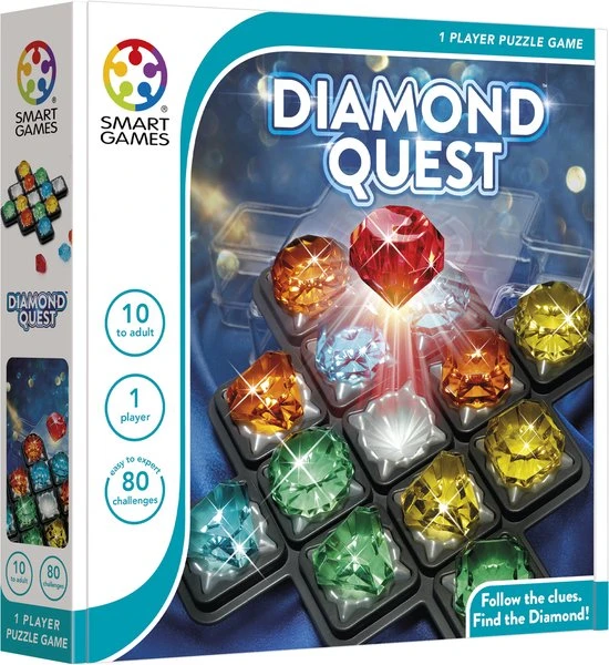 Volg de aanwijzingen en vind de rode diamant! Daal af in de SmartGames diamantmijn en graaf alle juwelen op. Gebruik de ?mijn? van informatie aangeboden door de hints en aanwijzingen in elke uitdaging om de locatie van de rode diamant te achterhalen. Hoe dieper je graaft, hoe meer je deductievaardigheden worden getest! Diamond Quest is een uniek puzzelspel met 80 uitdagingen, van makkelijk tot expert.