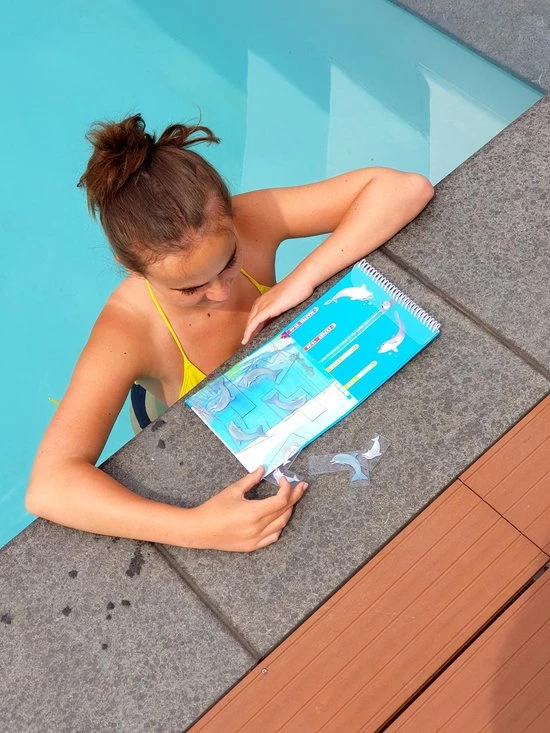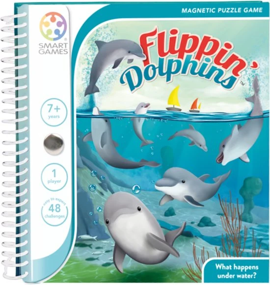 Kies een opdracht en plaats de puzzelstukjes op het magnetich speelbord zodanig dat de dolfijnen in de opdracht overeenkomen met de dolfijnen op het bord.