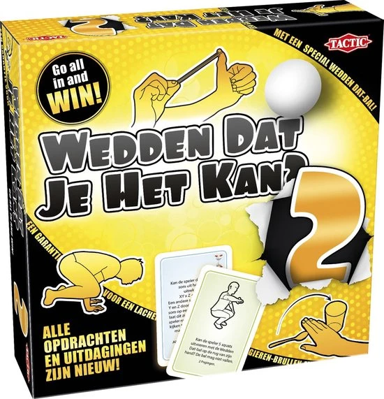 Zin in een hilarische spellenavond? Laat je vrienden of familie zien dat je net zo goed op ??n been kunt staan met de speldoos op je hoofd als dat je kunt hoofdrekenen. Voor de passieve vragen moet je slim zijn en voor de actieve vragen is handigheid of souplesse vereist. Kun jij een rondje rond een stoel lopen met de speciale Wedden Dat-bal tussen je knie?n? Dat is Wedden dat je het kan? Soms krijg je een vraag, soms moet je een actie uitvoeren. En je wedt op de andere spelers. De vragen en uitdagingen zijn allemaal nieuw. De winnaar moet slim zijn, handig zijn en goed kunnen schatten wat de andere speler wel of niet kunnen! Wedden dat je een lachen-gieren-brullen avond zult hebben?