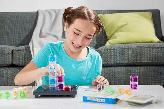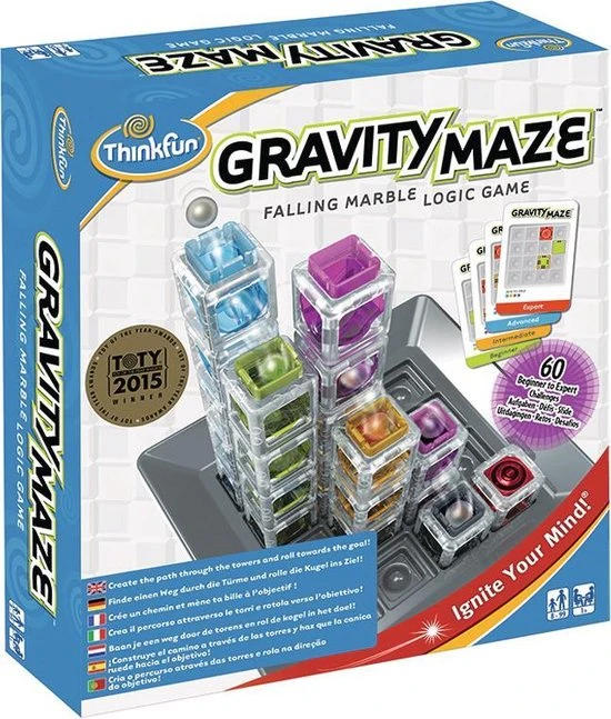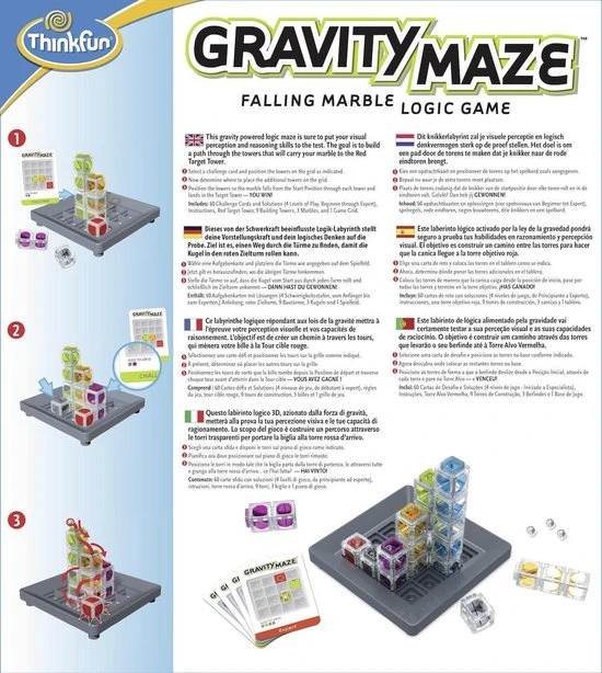 Baan je een weg door de torens en rol de kogel in het doel! Gravity Maze® stelt het voorstellingsvermogen en het logisch denken van de speler op de proef. Wie kan de transparante torens zo op het spelbord met elkaar combineren, dat de metalen kogel door alle torens rolt en in de rode eindtoren komt? Een ware uitdaging, want de torens van verschillende hoogtes hebben binnenin gaten, schuine hellingen maar ook horizontale vlakken. Alleen als de speler alle torens goed met elkaar combineert, ontstaat een ononderbroken weg voor de kogel door het labyrint.