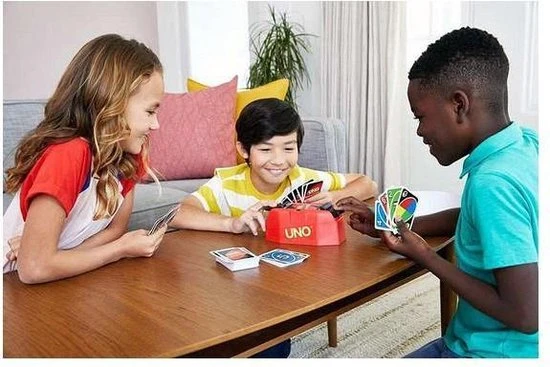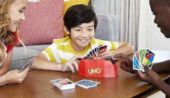 - Zorg dat je er klaar voor bent: wanneer het signaal van de UNO Showdown unit klinkt, moet je razendsnel reageren en op het pedaal duwen, zodat de kaarten naar je tegenspelers vliegen! Duiken allemaal!