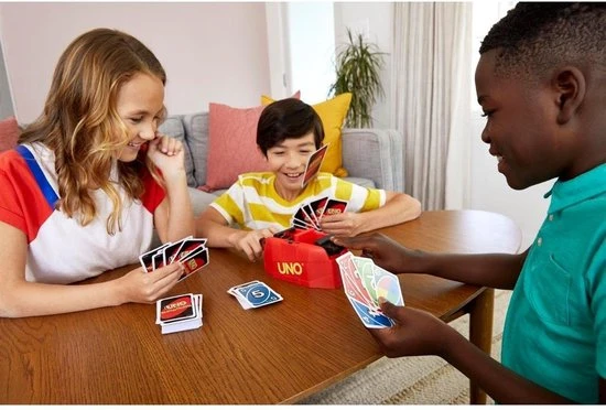 De spelers proberen zo snel mogelijk al hun kaarten uit te spelen door een bijpassende kaart in hun hand op de bovenste kaart van de stapel te leggen. En vergeet niet UNO te roepen als je nog ??n kaart over hebt! Leuk voor een spelletjesavond met kinderen, volwassenen of het hele gezin en een geweldig cadeau voor spelers vanaf 7 jaar.