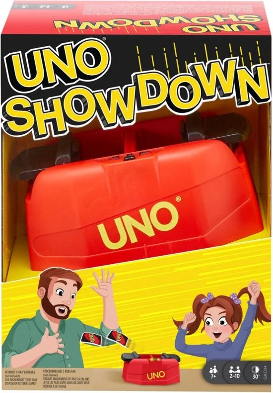 UNO Showdown is een kaartspel dat iedereen leuk vindt, maar met de onverwachte spanning van een plotselinge kaartenregen! Wanneer het lichtje aangaat en het signaal van de UNO Showdown unit afgaat, moet je zo snel mogelijk het pedaal omlaag duwen. De snelste speler wint de ‘showdown’ en laat kaarten uit de UNO Showdown naar de andere spelers vliegen!