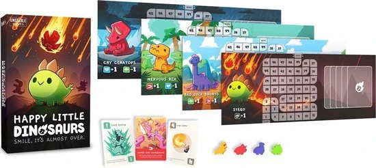 Lately, it feels like we?re all just dinosaurs trying to avoid the falling meteors. In this 2-4 player game, you?ll try to dodge all of life?s little disasters. You might fall into a pit of hot lava or get ghosted by your dino date, but the dino who survives it all wins the game! The first person to reach 50 points or the last one standing wins!
