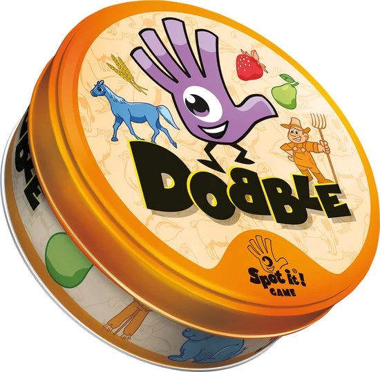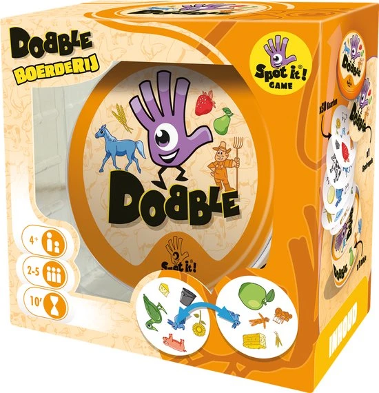 Vind de gelijke boerderij-symbolen op twee verschillende kaarten voordat je tegenstanders de symbolen zien! Bij Dobble Boerderij zijn snelheid, observatie en reflexen van groot belang om te winnen. Het spel bevat 30 kaarten waarop steeds 6 symbolen staan afgebeeld. Hierbij moet je bijvoorbeeld denken aan een tractor, varken, appel, konijn of een molen. Als jij de eerste bent die het symbool herkent mag je een kaart nemen, een kaart plaatsen of een kaart afleggen volgens de regels van de verschillende mini-spelletjes die je kan spelen.
